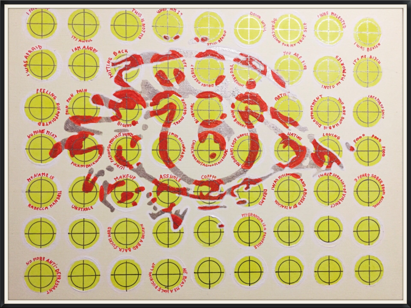 Ik zat in de knoop het een heleboel zaken. Het heden en het verleden zorgde voor kortsluiting. In dit werk heb ik geprobeerd mijn interne zaken te ordenen en te visualiseren zodat er ruimte zou ontstaan. ( zie de onbeschreven targets! )